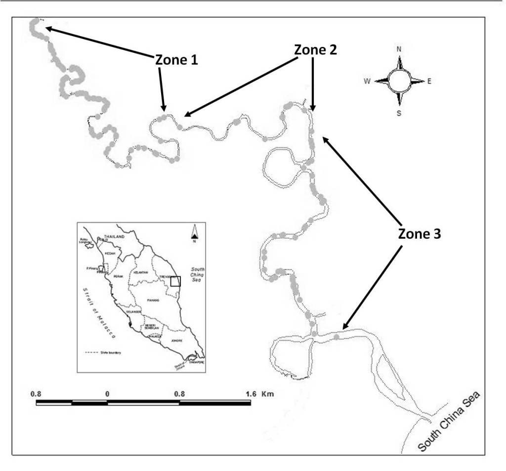 Map showing the geographic position of three firefly zones along Kerteh River, Terengganu. Grey dots represent the firefly display sections.